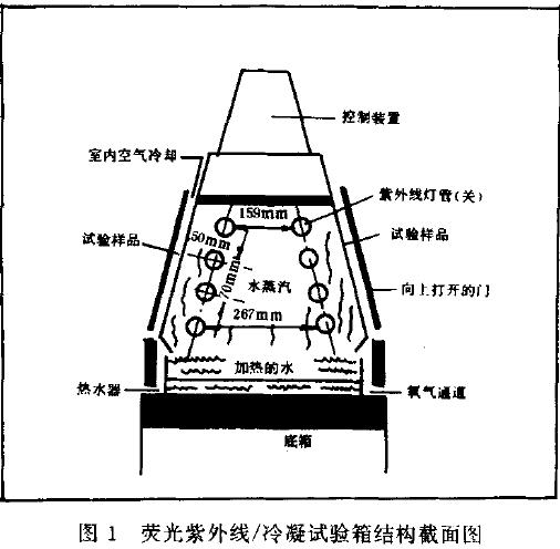 3. 1. 1 试验箱的结构由耐腐蚀金属材料制成,包含8 支荧光紫外灯.盛水盘.试验样品架和温度、时间控制系统及指示器(见图1) 。