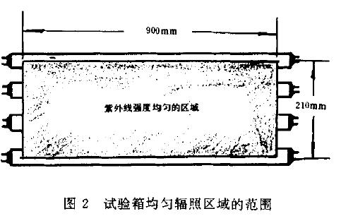 3.1.2 荧光紫外灯应快速启动,灯管功率为40 W. 灯管长度为1220 mm. 试验箱均匀工作区域的范围为900X210mm( 见图2) 。