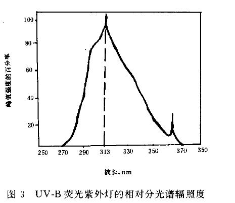 3. 1. 3 除非另有规定,荧光紫外灯的波长为280~315 nm , 即UV-B 波民范围,相对分光辐照度的特件(见图3) 。